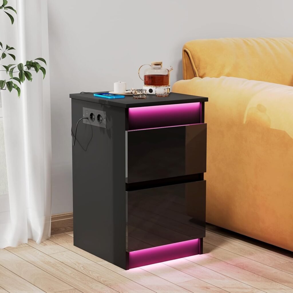 Ztexkee Alto Brillo Mesita de Noche con Enchufe y Tira de luz LED