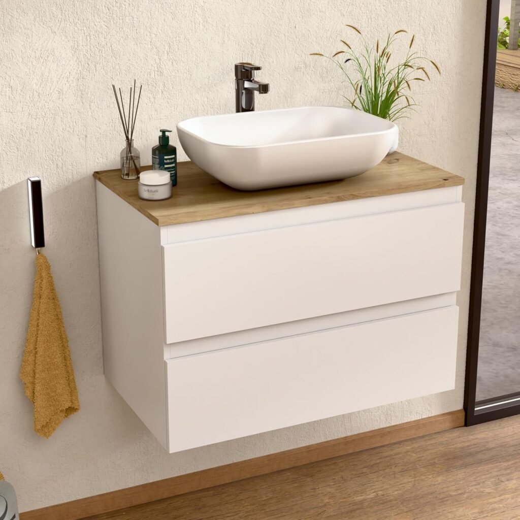 BELLOBATH - Mueble Baño Suspendido con Lavabo de Cerámica, Mueble Baño con Lavabo Montado con 2 Cajones, 100 x 55 x 46 cm, Mueble Blanco y Tapa Roble